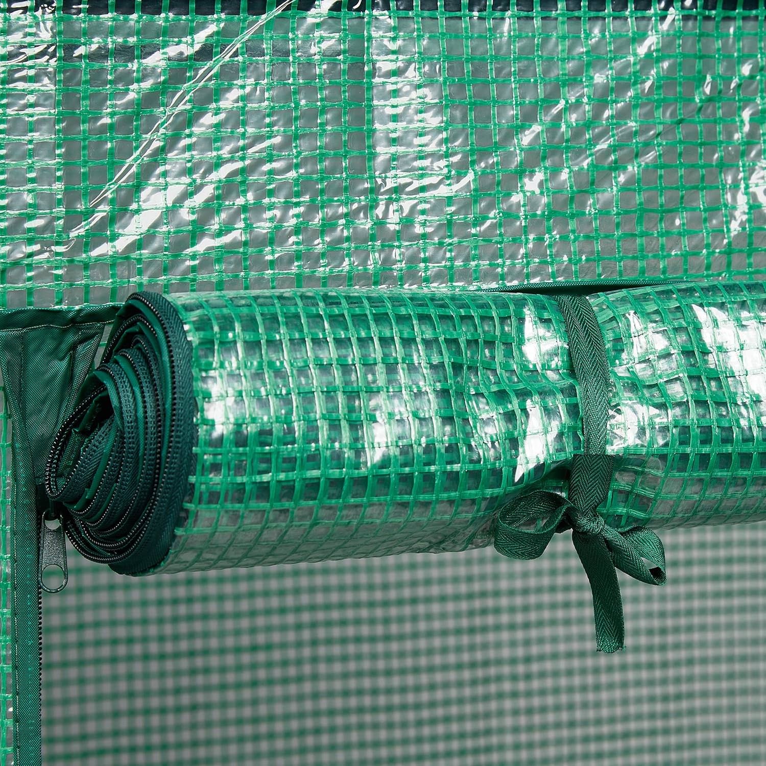 Das Gestell besteht aus pulverbeschichteten Stahlrohren. Die Hülle ist aus verstärktem 130-Gramm-Kunststoff produziert. Die Abdeckung ist unten extra lang, so dass Sie sie mit Sand beschweren können, um Ihr Gewächshaus fest zu fixieren, damit es direkt nach der Montage sicher gegen Wind und Regen isoliert ist.