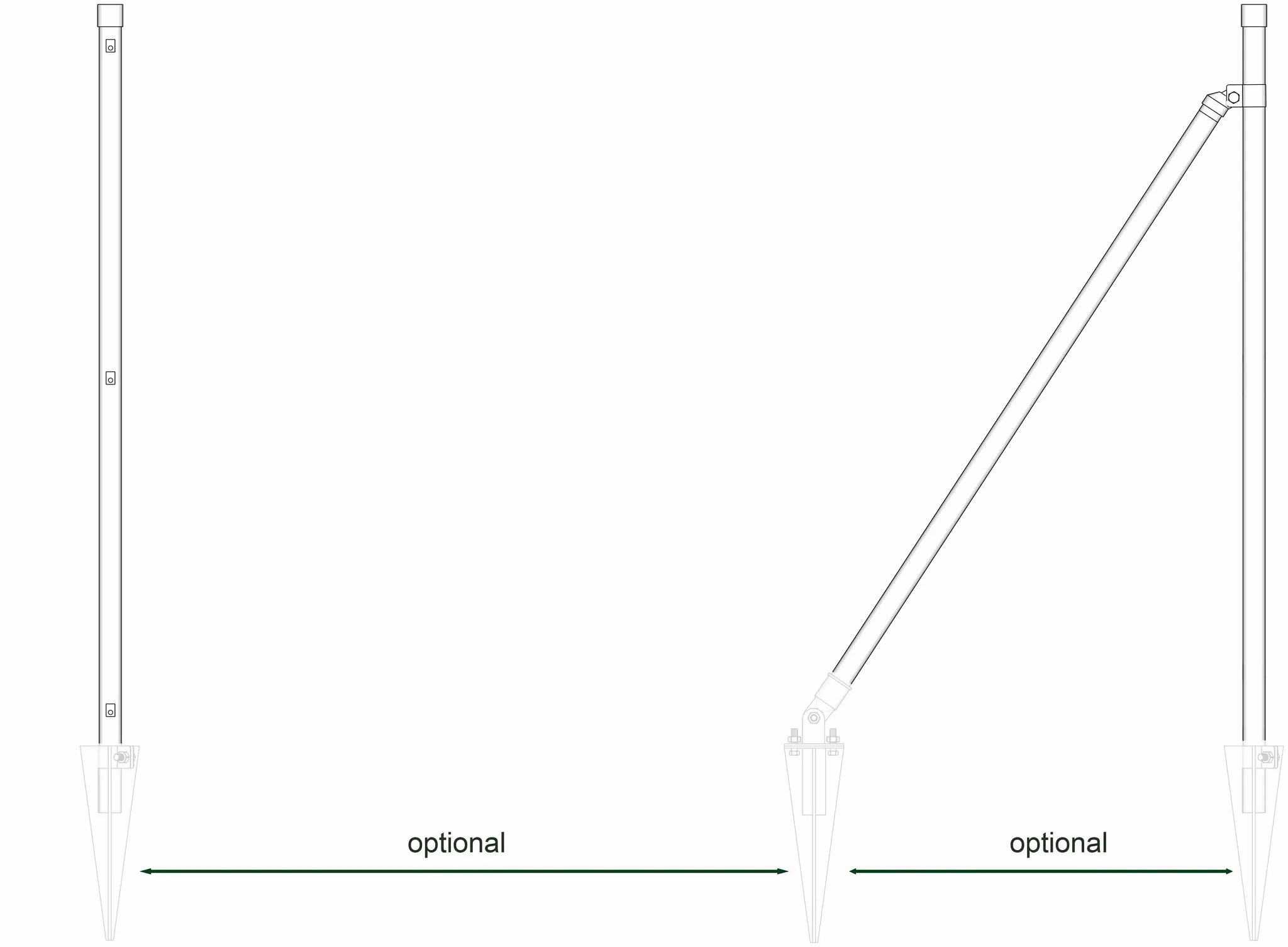 Im Set sind außerdem 2 Streben mit Halterungen sowie 2 Spannstangen zur Befestigung Ihres Metallzaunes enthalten.