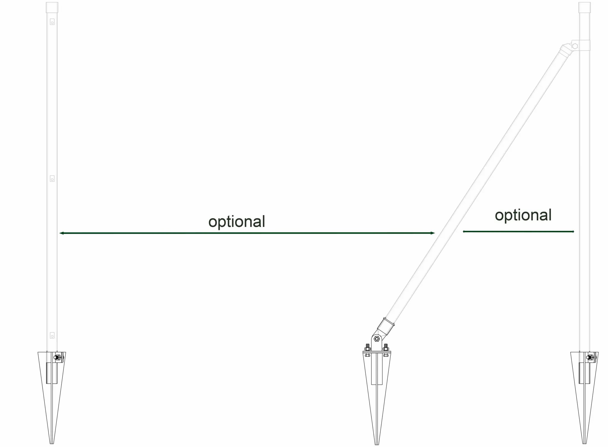 Das Set enthält 11 Pfostenhalter für Metallpfosten mit einem Durchmesser von 3,4 cm sowie 2 Pfostenhalter mit Montageplatte für die klappbaren Pfostenhalter für die Strebe.